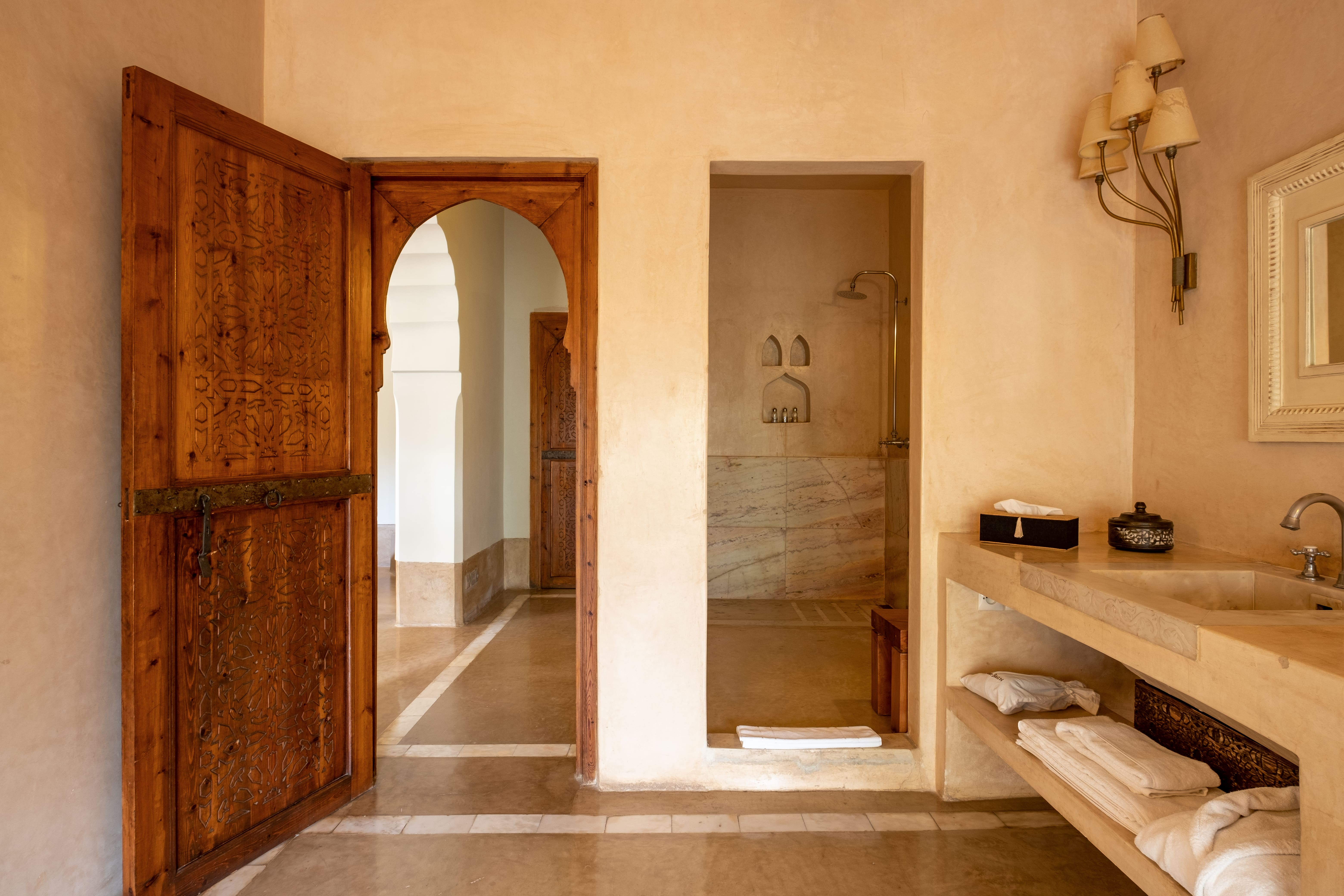 Every suite at Ksar Char-Bagh is equipped with a spacious bathroom crafted from marble or stone, featuring both a shower and a bathtub. The suites also include air conditioning, a dressing room, a fireplace, and the added luxury of a private garden, terrace, or pool.